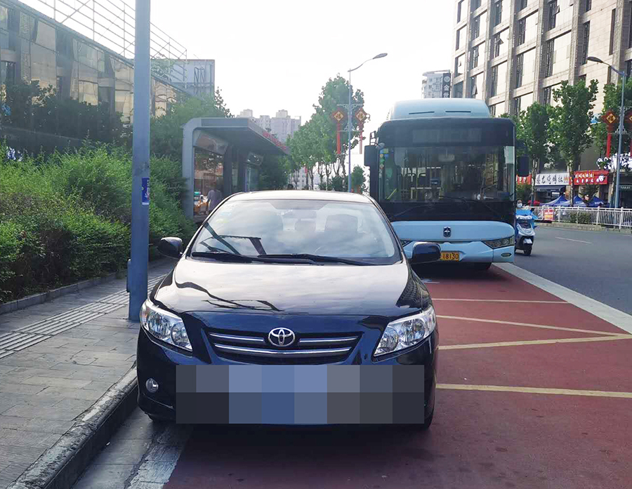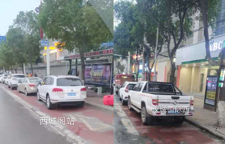 在金州廣場南站,十幾輛私家車“整齊劃一”的停在公交車站位置,地面紅色區(qū)域上的公交兩字也被完全覆蓋,從遠(yuǎn)處望去,站牌旁坐著幾個人正等待公交車的到來。在興華名城站,一輛私家車??吭诠卉囌厩埃倎淼墓卉嚐o法按其規(guī)定進站停車。在西城閣站和漢城國際西站,幾輛私家車甚是“任性”,儼然將公交車站當(dāng)成了“停車場”,筆者在此駐足十幾分鐘,它們依然“紋絲不動”,有的車上甚至沒有車主。