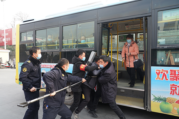 在火車站首末站,恰逢一車隊(duì)工作人員正在開展疫情防控應(yīng)急演練,一未佩戴口罩的乘客欲乘車,駕駛員制止后,該乘客非但不聽,強(qiáng)行上車后辱罵、持刀相向駕駛員,駕駛員隨即將情況報(bào)告車隊(duì)長并報(bào)警,車隊(duì)安保人員將其制服??赐暄菥毢?,熊衛(wèi)軍、錢萬輝對(duì)工作人員面對(duì)突發(fā)事件的應(yīng)急處置能力點(diǎn)贊。